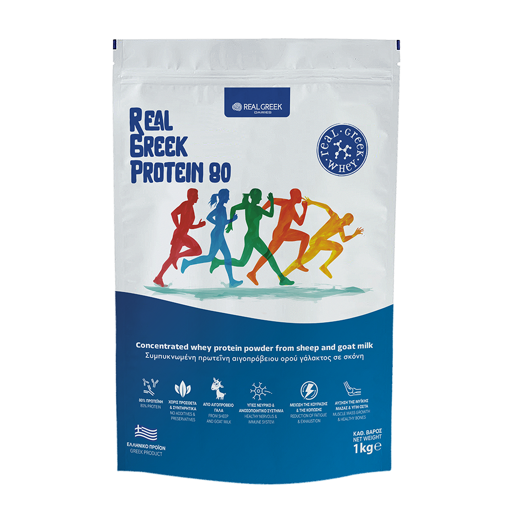 Αιγοπρόβεια Πρωτεΐνη ορού γάλακτος 1kgΗ κλασική αγαπημένη σκόνη πρωτεΐνης, Real Greek Whey 80 είναι 100% Ελληνική αιγοπρόβεια πρωτεΐνη ορού γάλακτος. Έχει περιεκτικότητα 82% σε φυσική, καθαρή πρωτεΐνη και δεν περιέχει συντηρητικά.